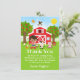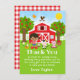 Esta linda y divertida tarjeta de agradecimiento presenta a una niña de pelo marrón con piel oscura junto a un granero rojo con una veleta de gallo. Hay adorables animales de granja como una vaca, un cerdo y una gallina. Al fondo hay un cielo azul brillante, manzanos, sol, mariposas y margaritas. El texto combina fuentes en negrita y sans serif para un estilo moderno y elegante. Esto es perfecto para una fiesta de cumpleaños con tema de granja.