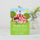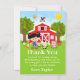Esta divertida y linda tarjeta de agradecimiento presenta a una niña de pelo negro con piel clara junto a un granero rojo con una veleta de gallo. Hay adorables animales de granja como una vaca, un cerdo y una gallina. Al fondo hay un brillante cielo azul, manzanos, sol, mariposas y margaritas. El texto combina fuentes en negrita y sans serif para un estilo moderno y elegante. Esto es perfecto para una fiesta de cumpleaños con tema de granja.