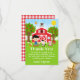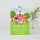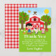 Esta linda y divertida tarjeta de agradecimiento presenta a un niño de pelo negro con piel clara junto a un granero rojo con una veleta de gallo. Hay adorables animales de granja como una vaca, un cerdo y una gallina. Al fondo hay un cielo azul brillante, manzanos, sol, mariposas y margaritas. El texto combina fuentes en negrita y sans serif para un look elegante y moderno. Esto es perfecto para una fiesta de cumpleaños con tema de granja.