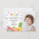 Tarjeta de agradecimiento de cumpleaños con frutas tropicales de acuarela. El diseño presenta una fotografía del niño que cumple años, texto moderno y colorido que dice 'Gracias', confeti de arcoíris, una variedad de frutas jugosas de verano y una plantilla de agradecimiento fácil de personalizar.