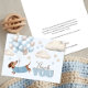Cute dachshund themed boy baby shower thank you card illustrated with an adorable dachshund wearing a blue sweater, floating amongst a bunch of soft blue and beige balloons. Playful clouds and stars add to the whimsical theme. This folded thank you card is sure to bring smiles whilst evoking a gentle, joyful vibe.