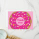 Tarjeta de agradecimiento de divertido diseño de donut rosa espolvoreado para fiesta de cumpleaños infantil. Diseño divertido para agradecer a sus invitados. Diseño de dulce para celebraciones con tema de repostería. Donut redondo con agujero.