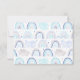 Tarjeta de agradecimiento de fiesta de cumpleaños infantil con ilustración dibujada a mano de un arcoíris azul con estrellas alrededor. El texto dice "gracias por hacer mi cumpleaños tan brillante". La parte trasera de la tarjeta tiene un patrón de arcoíris con nubes caprichosas y gotas de lluvia. Perfecto para el cumpleaños de un niño.