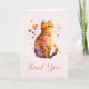 Tarjeta de agradecimiento doblada con un adorable ilustracion acuático. Un gato tabby naranja que parece agradable y feliz con corazones girando por ahí.