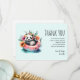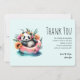 Gracias tarjeta con una adorable imagen de verano. Un diseño acuático con un panda blanco y negro sentado en una junta de natación en el agua. Rodeado de flores silvestres de bonito. Un oso totalmente frío.