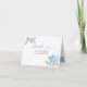 Tarjeta de agradecimiento de bonito para los clientes de la ducha de bebé y los que lo han apoyado durante su embarazo. La tarjeta dice "Gracias" en la tipografía de escritura azul y tiene un mensaje de agradecimiento impreso debajo. El mensaje dice "¡Realmente aprecio todo tu apoyo mientras nuestro pequeño bebé se está preparando y no puedo esperar a que lo conozcas!". Está decorado con flores acuáticas, una bonita tetera y una perfecta mordaza, perfecta para tomar un té fiesta o "un bebé se está preparando" con la temática de la ducha para bebés.