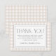 ¿Buscando una manera encantadora de expresar su gratitud? Nuestra tarjeta Baby Shower Gracias Beige Gingham Neutral es perfecta para añadir un toque de elegancia a su celebración. Con una delicada caligrafía de escritura y un elegante tema de ducha de bebé, el diseño de gingham clásico se adapta sin esfuerzo a cualquier ocasión neutral de género.
