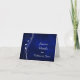 Esta tarjeta de agradecimiento de boda presenta un diseño de remolino de hoja plateada sobre un fondo azul profundo. Su texto personalizado está en plata a la derecha. Esta tarjeta coincide con las invitaciones de boda azules con remolino de hoja plateada en nuestra tienda.