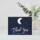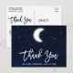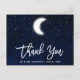 Tarjeta postal de agradecimiento de boda celestial con letra de pincel moderna. Cielo nocturno azul con estrellas y luna en acuarela.
