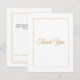 Esta elegante tarjeta de agradecimiento presenta un borde dorado minimalista y tipografía sofisticada que coincide perfectamente con el conjunto de boda AuraAmetrADesign. La parte trasera incluye un mensaje sentimental de gratitud, que se establece como una plantilla totalmente editable para que puedas personalizar la redacción o agregar tus nombres. Es el toque final perfecto de alta gama para expresar tu agradecimiento a los invitados después de tu día especial.