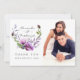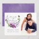 Tarjetas de agradecimiento de boda con flores de violeta, lavanda y púrpura en una corona pintada a mano, diseñadas para ser personalizadas rápida y fácilmente según los detalles de su evento.