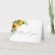 Una tarjeta de agradecimiento de boda botánica rústica y cálida con girasoles brillantes y follaje de eucalipto. Ideal para bodas de otoño, campo o al aire libre. Personaliza con tus nombres para un agradecimiento alegre y sincero.