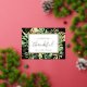 Esta moderna tarjeta de agradecimiento tropical presenta hojas de palma, filodendro y helecho en verde y dorado sobre un fondo negro. Un elegante marco de lámina dorada resalta el texto en lámina oscura. Salpicaduras de lámina dorada acentúan este diseño botánico exótico y aportan un toque de capricho sofisticado a la invitación. La parte posterior puede tener un mensaje personalizado impreso en cada tarjeta o puede dejarse en blanco para permitir un mensaje escrito a mano por la novia y el novio.