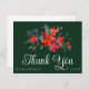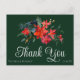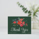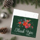 Esta hermosa tarjeta de agradecimiento de boda de vacaciones personalizada verde presenta una bella acuarela de flores de poinsettia rojas y hojas de pino para Navidad. Elegantes tarjetas de invierno con flores festivas para las fiestas. Personalice con los nombres de la pareja y la fecha de la boda.