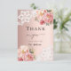 Una tarjeta de agradecimiento de boda moderna y elegante. Un fondo con gradiente dorado rosa. Decorado con rosas doradas rosa, flores y encaje de color rosa pálido. En la parte frontal el texto: Gracias, futura sra.