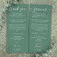 Una elegante tarjeta de agradecimiento de recepción de boda con celebración de verde eucalipto que se puede personalizar en la parte delantera y trasera con su mensaje especial de agradecimiento en diferentes idiomas, en tipografía elegante. Un recuerdo especial, gracias a sus invitados. Diseñado por Thisisnotme©