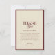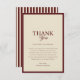 Esta tarjeta de agradecimiento de boda con borde de rayas de marfil y borgoña presenta una base de crema cálida con acentos de borgoña rico y elegante letra contemporánea en un estilo retro sutil. La paleta crea una estética refinada de dinero antiguo, vintage-meets-moderno, perfecta para celebraciones de otoño e invierno. Diseñado para coordinar con el conjunto retro de rayas de marfil y borgoña para un look de papelería cohesivo y atemporal.