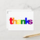 Envía a alguien una nota de agradecimiento alegre y colorida. Esta tarjeta postal presenta la palabra "gracias" en una tipografía en negrita. Cada letra está coloreada como la bandera del arcoíris del Orgullo y se establece sobre un fondo blanco simple. El reverso está personalizado con su dirección de remitente.
