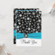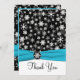 Esta tarjeta de agradecimiento de copos de nieve negra y blanca tiene una cinta azul acua FAUX y un medallón de copo de nieve. Coincide con la invitación de boda que se muestra a continuación. También hay una tarjeta de agradecimiento de estilo de tarjeta de saludo pequeña que se muestra a continuación, si lo prefiere. Si necesita otros artículos coincidentes en este diseño, envíe su solicitud a niteowlstudio@gmail.com.