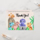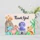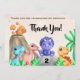 Esta es una adorable tarjeta de agradecimiento de cumpleaños con tema de dinosaurios para la fiesta de cumpleaños de un niño. La ilustración consiste en 4 adorables dinosaurios bebé con un volcán en el fondo y algo de follaje. La tarjeta se puede personalizar con tus propios datos.