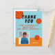 Tarjeta postal de agradecimiento de cumpleaños con foto temática de baloncesto. Tarjeta de agradecimiento de cumpleaños con foto con un mensaje de agradecimiento, nombre del niño, foto del niño y balones de baloncesto. Personalízala con tu nombre y la foto de tu hijo. Puedes cambiar o borrar cualquier texto. Agradece a familiares y amigos por hacer que tu cumpleaños sea especial. Ideal para niños que aman el baloncesto y los deportes.