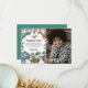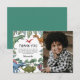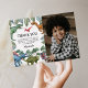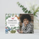 Tarjeta de agradecimiento de cumpleaños jurásica con un fondo negro liso, una dulce foto de su hijo, follaje verde de la selva, una colección de dinosaurios de acuarela y una plantilla moderna de agradecimiento personalizada fácil de personalizar.