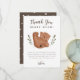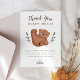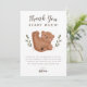 Tarjeta de agradecimiento de fiesta de cumpleaños infantil con tema de oso adorable con ilustración de un cachorro rodando sobre su espalda con hojas verdes a los lados. El mensaje agradece a los invitados por asistir a la fiesta. El texto en la parte superior dice "¡Muchas gracias, oso!" Genial para la fiesta temática de bosque de tu hijo.