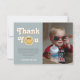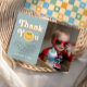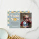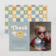 Esta tarjeta de agradecimiento de cumpleaños para niños con tema de sonrisa azul captura vibraciones retro de los 70 con un tema de sonrisa azul y un patrón de cuadros azul pastel en la parte posterior. Totalmente personalizable, incluye espacio para tu mensaje, foto y nombre. Perfecta para un cumpleaños boho de "Un Chico Genial".