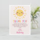 Linda tarjeta de agradecimiento de cumpleaños con un sol adorable, texto multicolor y arcoíris en un fondo rosa. Esta tarjeta de agradecimiento de cumpleaños con tema de sol es una forma linda de agradecer a los invitados por venir a la fiesta de cumpleaños con tema de sol de tu pequeña.