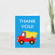 Tarjeta de agradecimiento de cumpleaños para niños con camión de volteo. Diseño adorable de camión de volteo de juguete para niños para dar las gracias por venir al baby shower o fiesta de cumpleaños número 1. Color de fondo personalizable. Mensaje de agradecimiento personalizado en el interior. Tipografía moderna.