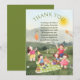 Muestra tu agradecimiento con esta divertida y linda tarjeta de agradecimiento de cumpleaños para niños. Un gesto considerado después del evento. La tarjeta presenta una escena alegre de picnic rodeada de naturaleza, aire fresco y cielos soleados. Vemos niños jugando, una cometa volando, un globo, un pastel, una guitarra, una cesta de picnic y un pajarito sentado en un globo. Incluye una fuente elegante de 'Gracias' y un mensaje personalizable.