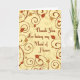 Tarjeta de agradecimiento de dama de honor para boda de otoño con colores clásicos y elegantes de la estación, con un patrón festivo de hojas y volutas. La manera ideal de agradecer a tu dama de honor en una boda otoñal. También disponible en formato de invitaciones, etiquetas y sobres.