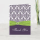 Esta tarjeta de agradecimiento de damasco verde lima y morado coincide con la invitación y otros artículos que se muestran a continuación.
