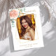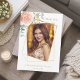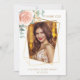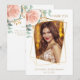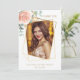 Frente: un marco de foto geométrico dorado falso. Decorado con una rosa rosa dorada, flor y verde de eucalipto. Personaliza y añade una foto, tu nombre y fecha.