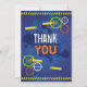 Una divertida tarjeta de agradecimiento inspirada en "Nerf" Wars para la próxima fiesta de batalla de dardos de su hijo. Con dardos voladores y un soldado sosteniendo un lanzador. La parte delantera y trasera de esta tarjeta seguramente impresionarán a sus invitados. La invitación coincidente está disponible en la tienda. Diseñado por www.invitecentral.com