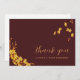 La tarjeta de agradecimiento Luxury Dark Burgundy & Gold Flowers tiene un fondo de color burdeos oscuro que está adornado con un intrincado patrón de vegetación floral dorada y tipografía moderna. La combinación del rico burdeos y el dorado brillante crea una estética elegante y lujosa.