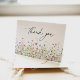 Una tarjeta de agradecimiento con tema de flores silvestres, perfecta para cualquiera que ame la belleza de la naturaleza. Los tonos suaves de púrpura y las delicadas flores de campo crean un ambiente romántico y caprichoso que seguramente impresionará a tus invitados.