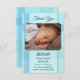 Tarjeta de agradecimiento de género neutro para bebé con una foto de su propio bebé en un fondo a cuadros azul pastel turquesa.
