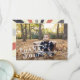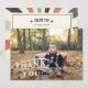 Agradece a los invitados al cumpleaños de tu hijo con esta tarjeta plana de estilo vintage con carpa de circo. El diseño presenta una ilustración de una carpa de circo en acuarela con letras de cartelera vintage y tu mensaje personalizado preimpreso. Agrega una foto favorita en el reverso con "gracias" superpuesto en letras de estilo carnaval blanco.