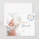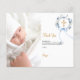 Una tarjeta de agradecimiento de bautizo moderna y elegante. Un fondo blanco chic decorado con una corona floral azul acuarela, un lazo y una cruz dorada. Personalice y agregue la foto del niño, nota de agradecimiento y nombre.