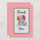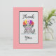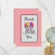 Esta tarjeta de agradecimiento tiene un adorable gato gris y negro con grandes ojos verdes sobre ella. Su cabeza está adornada con una hilera de flores rojas, rosas, amarillas y violetas. Su cuello está adornado con una linda cinta rosada.