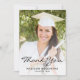 Tarjeta de agradecimiento para graduación moderna que incluye una foto vertical personalizado en la parte delantera y una foto horizontal en la inversa. Las palabras "Gracias" aparecen en escritura negra, con su nombre y año de graduación debajo en letra sans serif. Personalice el reverso con un mensaje de su elección en sans serif negro y agregue su línea de firma en letra decorativa de escritura a mano. Reemplace fácilmente las imágenes de ejemplo con sus propias fotos. Una pantalla de degradado blanco ayuda a asegurar que el texto de la parte delantera de la tarjeta aparezca. Ideal para graduación de secundaria o universitaria.