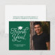 Esta elegante y festiva Tarjeta de agradecimiento de graduación incluye las palabras "Gracias" que se muestran en una fuente de escritura blanca. El fondo es verde, pero se puede cambiar a cualquier color que se elija. La parte posterior de la tarjeta contiene un área de mensajes así como un espacio en blanco debajo para que el graduado firme su nombre y posible nota escrita a mano adicional. Una forma bonita y sencilla de agradecer a los clientes.