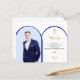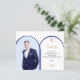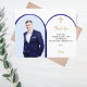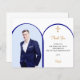 Añadir una foto de tamaño vertical. Marco fotográfico en forma de arco azul marino. Un color de fondo blanco. Personalice y agregue un nombre y detalles. 1 hoja = 1 Gracias tarjeta impresa de borde a borde.