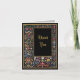 Una tarjeta de agradecimiento editable con arte gótico vintage de un antiguo manuscrito iluminado, flores coloridas y hojas deslizantes sobre un fondo negro en el frente y elementos manuscritos en el interior.