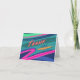 La tarjeta de agradecimiento presenta una tipografía de colores llamativos de "Gracias". Este diseño incluye elementos de verdes, naranjas, pintas y violetas, colores en bloque y elementos de diseño abstracto inspirados en los años 90.