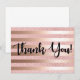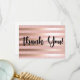 Tarjeta de agradecimiento de hermosa caligrafía simple. Esta tarjeta de agradecimiento femenina es perfecta para elegantes duchas de novia o para agradecer a tus damas de honor o niña de las flores. Dos tendencias de color muy populares y brillo mezclados crean un patrón moderno, lujoso y elegante. Esta tarjeta de agradecimiento moderna y de moda presenta una mezcla de rayas de falso brillo de rosa dorado y falso foil rosa. El interior está vacío, personaliza esta tarjeta agregando tu propio texto especial en el interior.