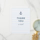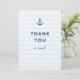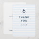Esta plantilla de tarjeta de agradecimiento temática náutica personalizada es perfecta para agradecer a los invitados y a los que envían buenos deseos en diversas ocasiones, incluyendo bodas, nacimientos, jubilaciones y otros hitos. Cuenta con un ancla azul marino y texto en azul sobre una base que incluye rayas horizontales azules suaves. El ancla no tiene un color uniforme, hay motas sin color, lo que le da un aspecto cálido y desgastado y un sabor a mano que nos recuerda a una impresión de bloque de madera o una talla de madera. De hecho, la imagen del ancla que inspiró este diseño se hizo originalmente con un sello simple, lo que explica su encanto. En el reverso hemos incluido algo de texto de marcador de posición en el mismo tono dorado. Puede incluir su(s) nombre(s) al final de su mensaje personalizado, o dejarlos fuera a favor de firmarlo a mano. Y por supuesto, si lo prefiere, puede hacer que la parte posterior sea completamente en blanco para que pueda escribir su mensaje completamente a mano. En cualquier caso, por favor asegúrese de eliminar nuestro texto de marcador de posición. También puede cambiar el color de fondo en la parte posterior
