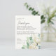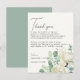 Esta tarjeta de agradecimiento de recepción floral de magnolia eucalipto blanca con acuarela y vegetación es perfecta para una boda elegante. Coloque estas tarjetas en el lugar de la mesa para cada uno de sus invitados en la recepción de su boda. Personalice la tarjeta con sus nombres y un mensaje especial de agradecimiento.