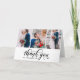 Elegante, moderna y caprichosa tarjeta de collage de tres fotos para agradecer a sus invitados por ser parte de su día de boda. Esta tarjeta de agradecimiento personalizable presenta superposición de caligrafía moderna negra. Este diseño también está disponible en otras tarjetas y colores.